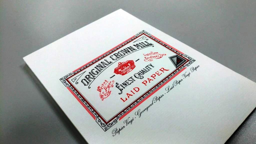 把「Belgium」和「Cream Laid Paper」丟上網路搜尋,答案不約而同指向這一家「Original Crown Mill」。根據相關說明,Original Crown Mill的歷史最早可追溯至1478年,1870年開始生產簾紋紙,並受到王室愛用。而商品標籤印著大大的「Cream Laid」,表示紙質有如奶油般細緻絲滑。