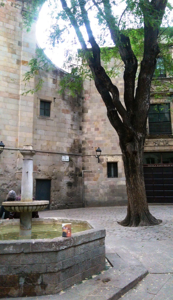 (《風之影》努麗亞所居住的聖菲力普聶利廣場,薩豐描述努麗亞會坐在廣場上閱讀。也被譽為歐洲最適合閱讀的地方之一。牆壁上至今仍保留著內戰時期的彈孔。)