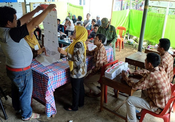 *西爪哇省第二選區,抗爭派印尼民主黨的國會議員候選人阿迪加(右)與省議員候選人(左)的聯合競選文宣。宣傳主軸在於:不管什麼選舉,請民眾記得戳「三號黨的七號候選人」就對了!(那兩支用來戳選票的釘子,未免太萌……)