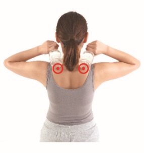 4. 最後手拿寶特瓶前端,將側面放在肩井穴附近。可左右兩邊同時熱敷。(肩井穴:肩峰與大椎穴(頭部往前傾,最突出的椎骨下方))