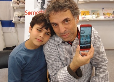 (2016年,艾加凱磊一家三口受邀來台,並且在台北國際書展舉辦簽書會。凱磊的兒子全程參與,唱作俱佳。新書《我絕非虛構的美好七年》第一年第一篇就描述了他兒子出生的時刻,遇到轟炸。圖為凱磊驚喜地為讀者簽了一本《再讓我說個故事好不好》電子書。)