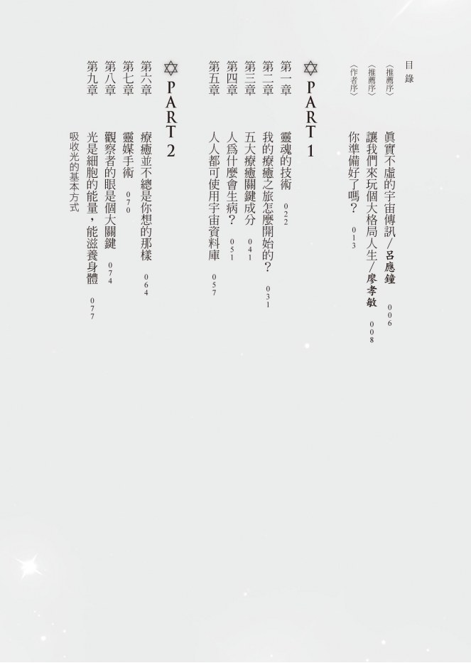 星癒技術並非只有療癒個人的能力,也會療癒整個星球。星癒技術結合了能量科學及量子學,加上活耀的想像力與實體成效的專注意圖。傑瑞療癒過無數的癌症、憂鬱症、腫瘤、情緒創傷、車禍等身心層面的案例,書中蘊藏豐富的指導與細節,而你、我或任何進行療癒的人都只是在促進療癒的過程,是能量、智慧本源或意識在發揮作用,外星之光的自然性質才是工具。