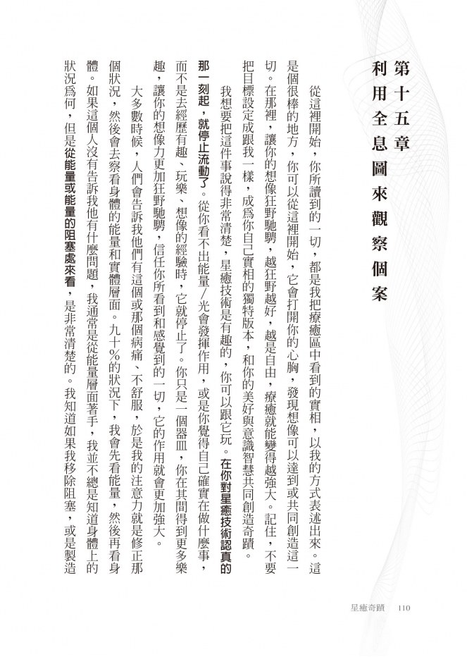 第十五章 利用全息圖來觀察個案 器官/神經系統/骨骼與氣場/能量繩索/零點或顛倒場域/ 團體療癒 第十六章 基礎療癒方式與觀想