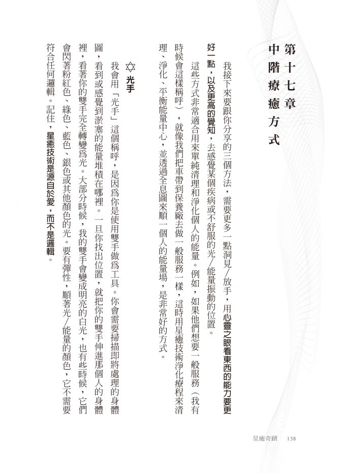 星癒技術是在超意識的層面中運作,你沒有辦法以思考去理解它。如果你試圖相信星癒技術,它也不會為你發揮作用。你必須深入、深深進入到你無限大腦的迷宮,以及無畏之心的深處。在這裡,如果你準備好放掉表面的世界、五感,進而擴張你的意識,記起所有三百六十種以上的感知能力,並且繼續旅行,你就非常有機會知曉自己的能力。