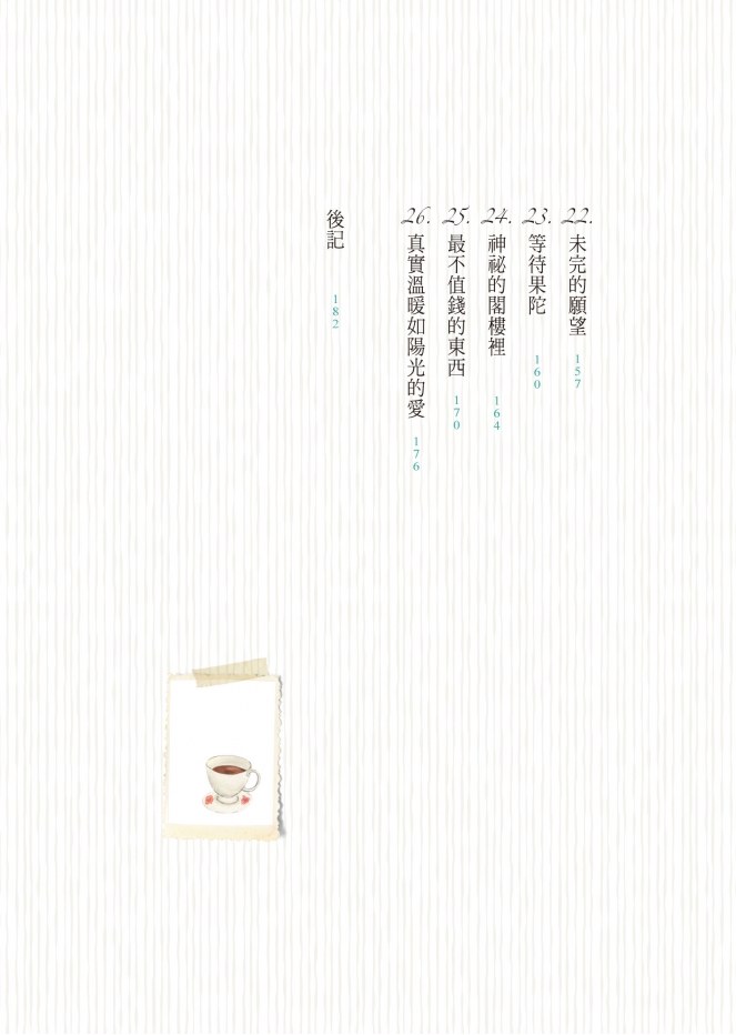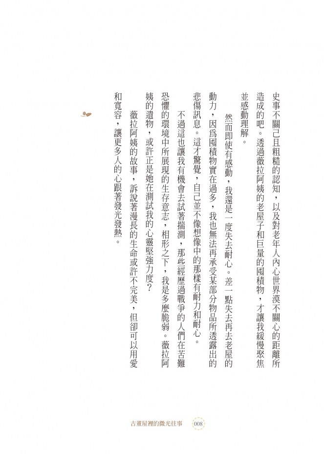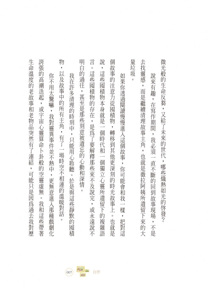 你不用太驚嚇,我對靈異事件並不熱中,更無意進入那種戲劇化誇張的高潮迭起,或宇宙心靈算命卜卦般的空靈虛無。我和這些帶著生命溫度的老故事和老物品突然有了連結,可能只是因為過去我對歷史事不關己且粗糙的認知,以及對老年人內心世界漠不關心的距離所造成的吧。透過薇拉阿姨的老屋子和巨量的囤積物,才讓我緩慢聚焦並感動理解。