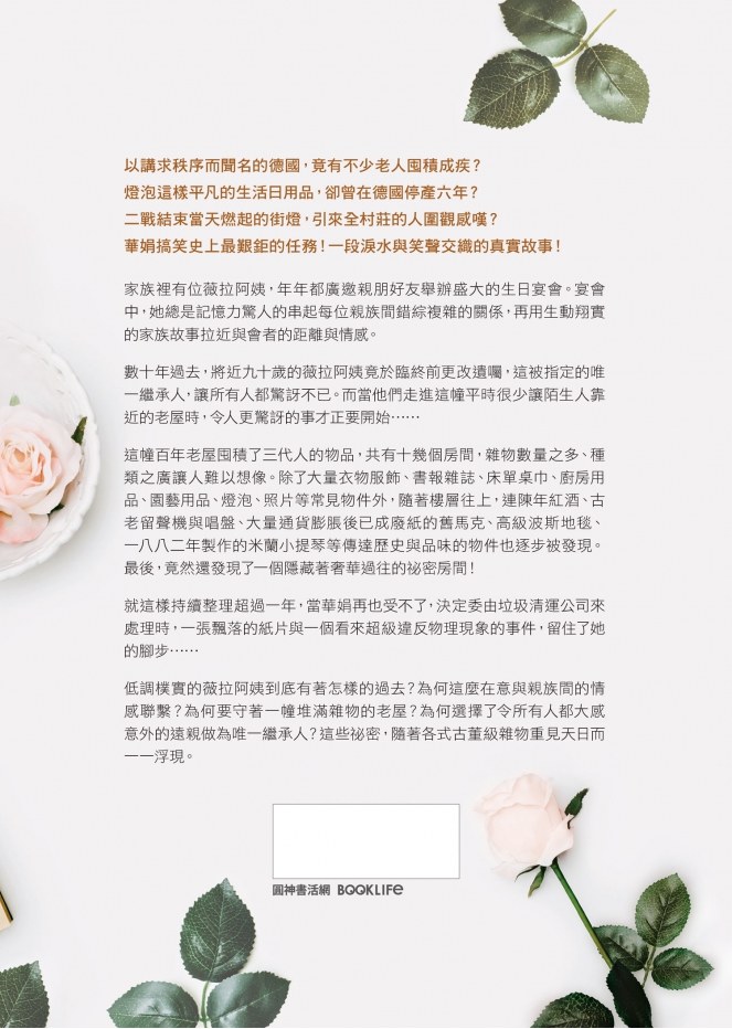 一份突如其來的遺囑、一幢堆滿雜物的老屋,讓他們整整花了一年的時間清理。隨著一扇扇被打開的房門,塵封已久的祕密與寶物逐一重見天日……華娟以特有的風趣筆調,帶你一起走進這個交織著微光與淚光的故事。