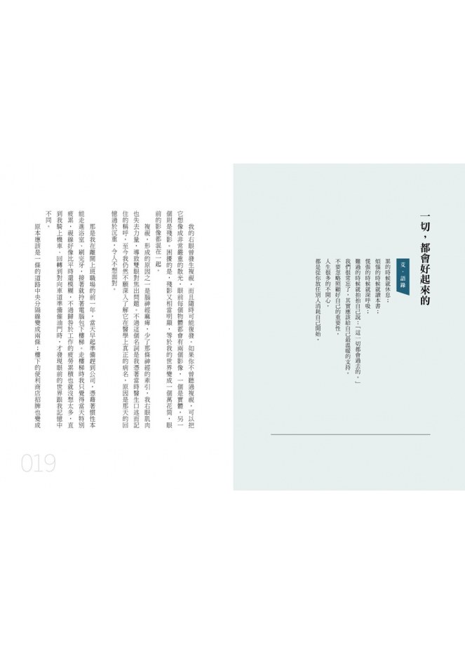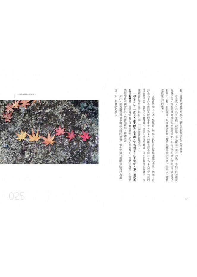 如同改變我人生的那件事,發生時讓我極度沮喪,彷彿我正漂泊在海上,卻遇到再也抹不去的黑夜,望著天空卻看不見未來的方向在哪裡。最後,我就是靜靜的等它過去,才有機會重新找回喜歡自己的力氣。此刻,我走過來了,相信你也可以。