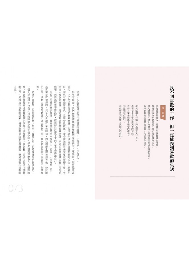 從那些信件中,我看見許多過去我也有的徬徨,抱著可以分擔心情的想法,我試著以朋友的角度分享愈來愈多這類的文章。一路寫下來,我得到很多讀者的回饋與鼓勵,之中所產生的共鳴,更是反過來支持著我繼續往想要的未來前進,就像我現在也想用這本書支持著你一樣。