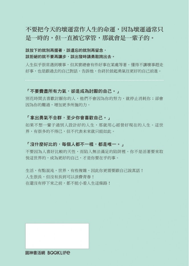 經由此書,我想告訴你,不要把今天的壞運當作人生的命運,因為壞運通常只是一時的,但你一直被它掌管,那就會是一輩子的。可以肯定的是,只要不被打倒,壞事終究會是個過期品。只要你還在,早晚它會結束;只要繼續往前,它就會離你愈來愈遠,最終留下更美好的事,等著你去追尋。