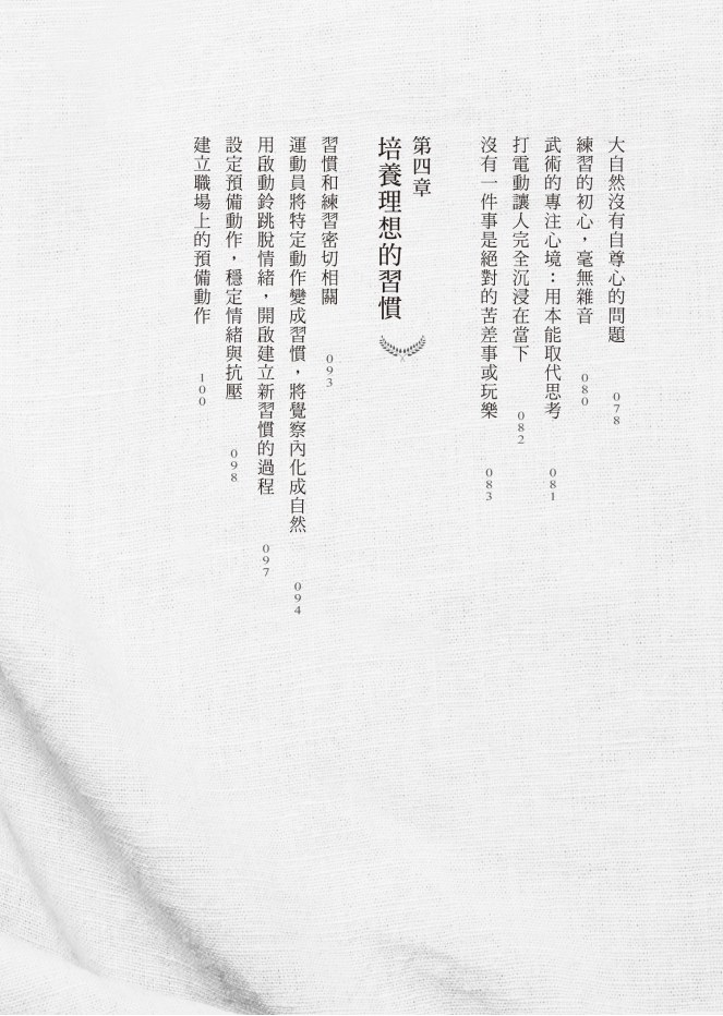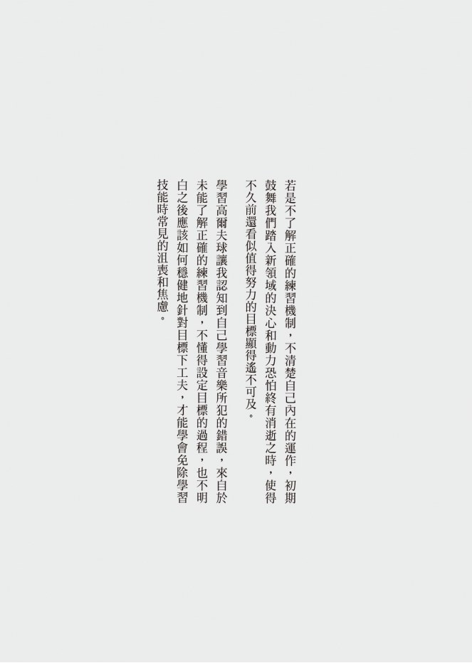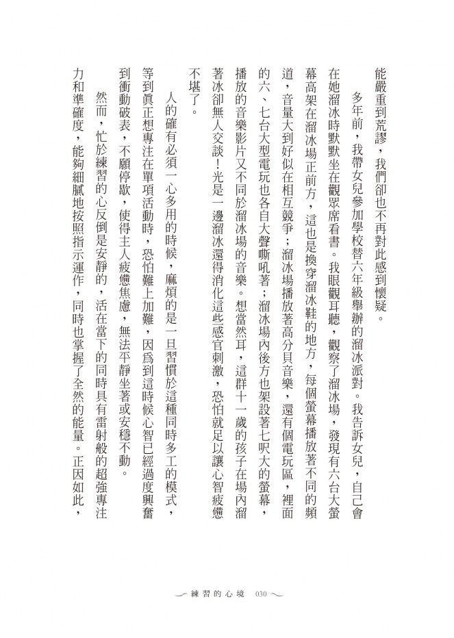 各位若是從未就此思考過,就先想想人生種種學習和精熟的項目吧,無論是行走、綁鞋帶、存錢、教養,都是透過某種形式的練習,說穿了就是不斷重複的歷程。大多時候我們並未意識到這個過程,不過這正是理想的練習型態──沒有壓力滿載的期待,也毋需自我質疑地想著「到底什麼時候才能達成目標?」,只要練習得當,當下艱難的學習過程自然消失無蹤,更重要的是,學習本身會昇華成能使內心平靜的歷程,讓人得以在「速度擺第一」的社會中,跳脫日復一日的焦慮和壓力,藉由練習休息喘氣。正因如此,極其重要的關鍵在於對於練習過程有所覺知、掌控並從中享受生活樂趣。