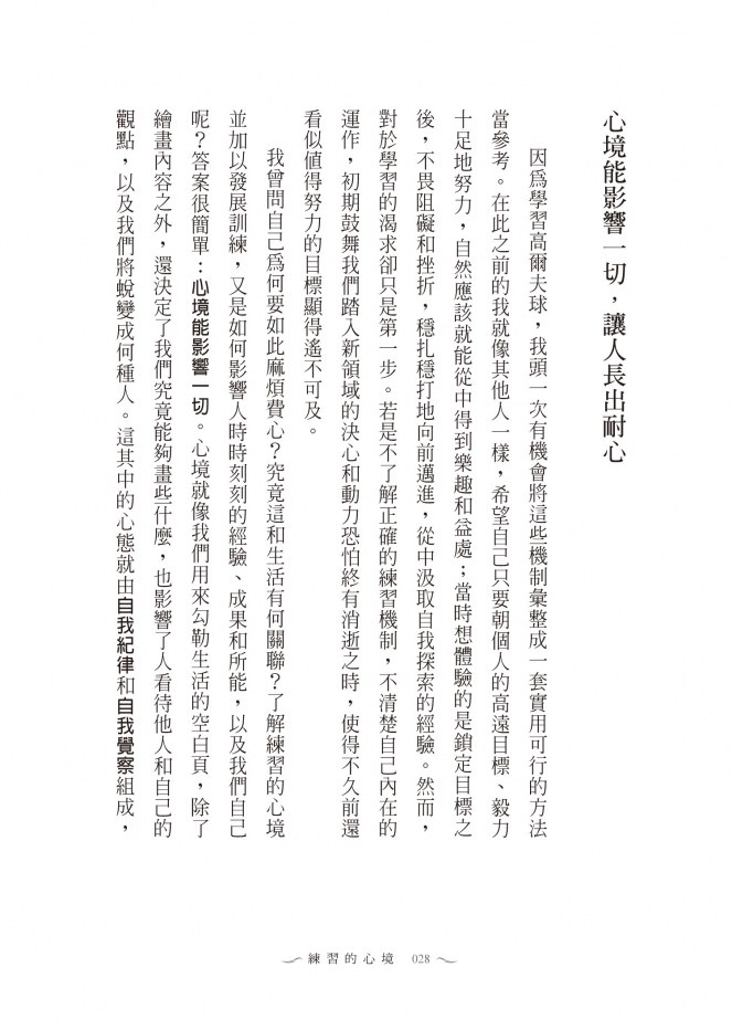 本書教你以簡單的方法培養練習的心境,在追求目標時以正念專注於過程,以輕鬆的身心「刻意而有心」地重複練習,免去不必要的內外掙扎。如此一來,你就不會因為壓力或焦慮而放棄,你的練習才能真正產生成果!