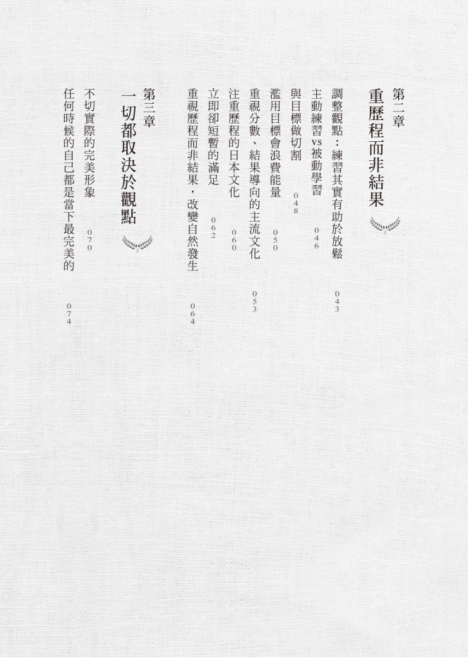 若能專注在體驗人生歷程,並投入其中,無論是追求個人理想或面對逆境,原本因為執著於目標而產生的壓力和焦慮都會大為減輕,不再緊守著「不達到目標必無法快樂」的執念。