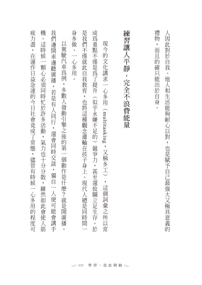 下回開車時試試什麼都不想,全心專注在開車上,留意其他駕駛的狀態和沿途的風貌,以及自己的手如何操作方向盤;如果沒有別人同行,就試著暫停所有內心對話並關掉音源。這麼做恐怕會令人抓狂,你會覺得自己不可能什麼都不想地只是開車,當初學開車時曾經如此簡單自然的狀態,在技巧純熟後竟成為不可能的任務。