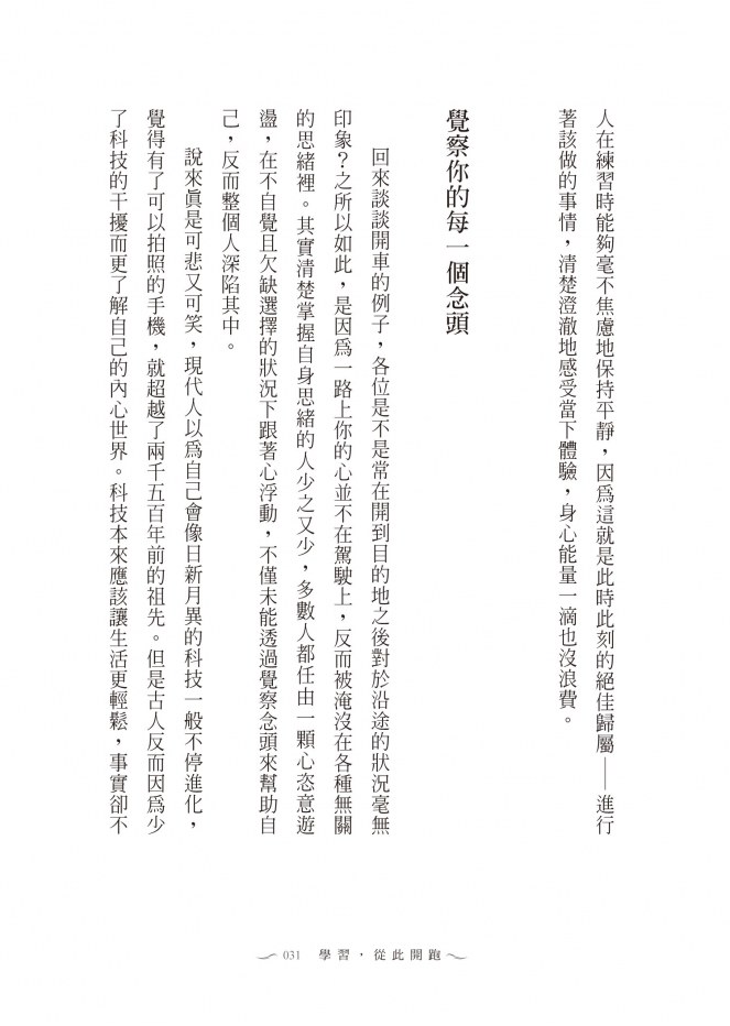 其實大家想必都曾多次體會過這種經驗,難就難在對於這種運作狀態若要有所覺察,本身就是矛盾。人全然專注於當下和正在進行的活動,就必定完全沉浸其中;如果注意到自己多麼聚精會神,專注力就等於打了折扣,因為這時專注的重點成了自己「本來」多專注在活動之上。如果真正投入練習,自然就不會注意到自己有多麼練習得當,只會留意到當下歷程並沉浸其中。