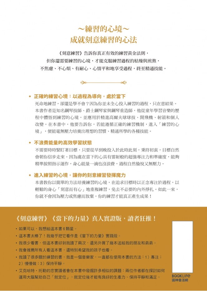 ★本書填補了「了解練習之道」和「真正精通技能」之間的鴻溝,並提供簡單的方法讓讀者於日常生活中運用。面對鬧情緒的孩子、工作量爆表或職場人際衝突,都可以運用練習的心境來處理。