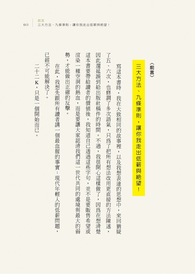 這是我一直以來深信不疑的終極策略,也是我靠著各種挫敗、閱讀,以及身邊貴人導師的成功法則分享,集結而成的方針,至今我還沒在市面上看到任何書籍以這樣的邏輯分享過,因此我非常驕傲這本書的發行,期望能夠真正幫助到一些人。就算無法改變每個讀者的人生,但我確定能讓年輕人即刻改變低薪與走出絕望困境,甚至在最後,都能成功或提早追求到自己的夢想、目標、期望的人生模型。