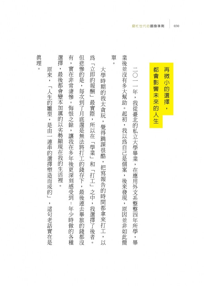 韓國、香港的年輕人,也都有相同困境(雖然在我看來,韓國年輕人被財團壟斷未來的處境,更悲慘、更難有轉圜餘地)。我在這裡不打算提政治、教育或任何敏感且與我的經歷不相關的議題,甚至,我拒絕抱怨,所以這也不會是一本能讓人取暖的書。就像看網路評論教訓這個、教訓那個一樣,看的瞬間很爽,可以得到短暫的麻痺與慰藉,但離開電腦桌後,依舊不去正視自己的劣勢處境與問題根本,那麼一切的痛楚還是會一直存在著。