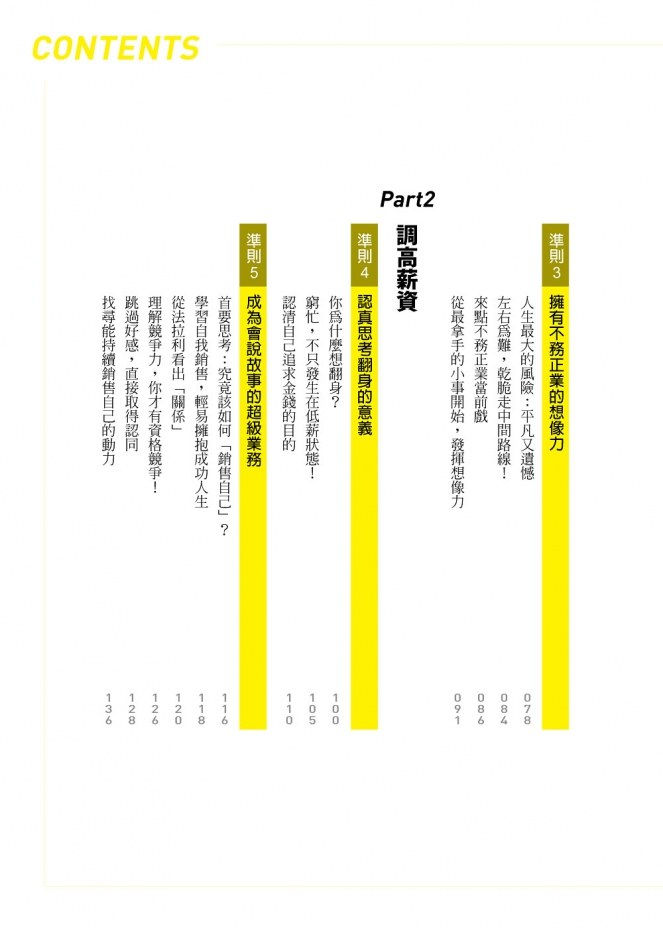 書中集結艾兒莎經歷的各種挫敗、用心觀察的人生百態、各種成功人士與貴人的經驗分享等,以實際案例與故事,加上打破框架的觀點,傳達9大準則,讓你:增加收入、調高薪資、變身資產!她要顛覆你根深柢固的思考邏輯,挑戰你原本相信的世俗理論,甚至只要專精、準確的執行其中一、兩條準則,絕對就能讓自己完全脫胎換骨、人生升等!