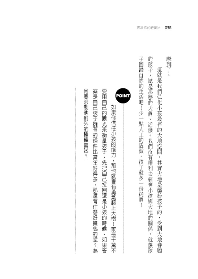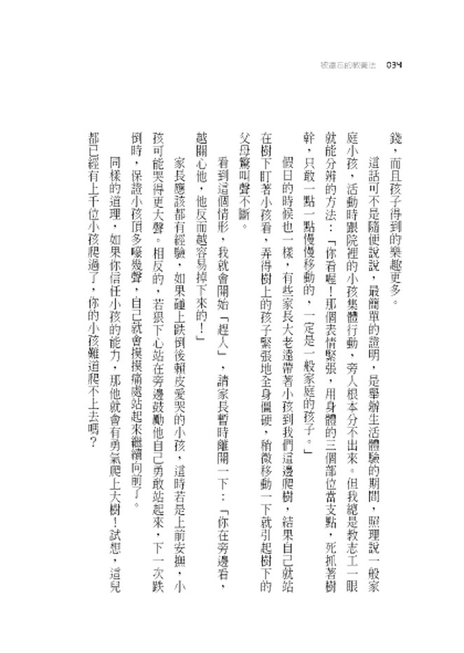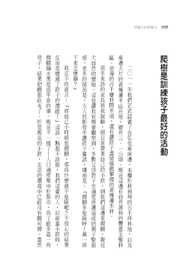 我忍不住直言:「你自己小時候也爬樹,那為什麼就不危險呢?不放心的結果反而是磨滅了孩子的潛能!」這話一點都不誇張,我們這輩的人,以前當小孩時,爬樹摘水果是很平常的事。現在不一樣了!人口過度集中於都市,為了能多蓋一些房子,結果把樹都砍光了。於是現在的小孩,生活的環境中已經沒有樹可爬。當然也可能是現在的家長非常保護孩子,一點點的危險都不讓小孩嘗試。