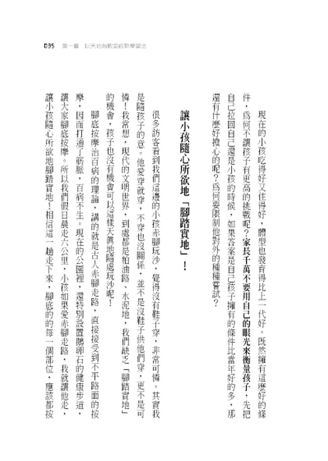 腳底按摩治百病的理論,講的就是古人赤腳走路,直接受到不平路面的按摩,所以打通了筋脈,百病不生。現在的公園裡,還特別設置鵝卵石的健康步道,讓大家腳底按摩。所以我們假日晨走六公里,小孩如果愛赤腳走路,我就讓他走,讓小孩隨心所欲地腳踏實地!相信這一趟走下來,腳底的的每一個部位,應該都按摩到了。