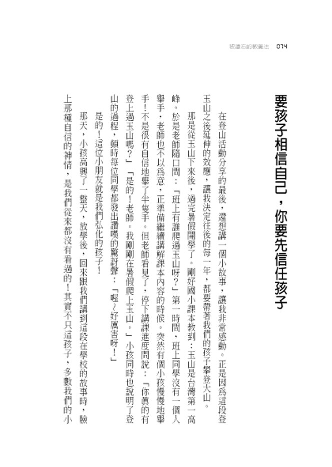 這也讓我想到,學齡中的孩子,總會對師長的種種要求有所抱怨、批評,很多師長因此讓步放水。我的看法剛好相反,該嚴格要求的還是應該要求,不滿就讓他們適度地發洩!我有我的堅持,對的事就去做,小孩子以後會懂得的。就像艱辛的登山活動,會在孩子的腦海中,留下永恆的記憶!唯有通過身心的嚴峻鍛練,才能讓孩子懷抱山一樣的自信!