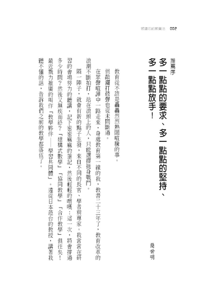 早睡早起是正常、教孩子做家事是正常、自己走路上學是正常、惜福地把餐盤裡的食物吃到一點不剩,是正常。當然!孩子不乖就得接受理性的處罰,這也是正常。沒想到這幾年開辦了「生活體驗」,我向來遵循的正常生活教育,竟被各界視為「另類」,掀起媒體爭相討論!更吸引3000多個孩子的家長,帶著孩子到我創辦的育幼院來體驗「另類的生活」。這樣的結果和發展真的讓我很意外,因為這裡教導孩子的東西都很簡單、也很正常,既不會要求孩子去挑戰極限,更不會要求孩子考試拿滿分!