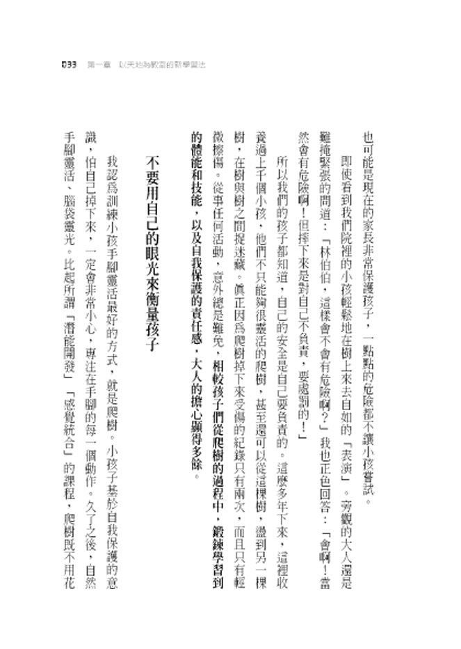 即使看到我們院裡的小孩輕鬆地在樹上來去自如的「表演」。旁觀的大人還是難掩緊張的問道:「林伯伯,這樣會不會有危險啊?」我也正色回答:「會啊!當然會有危險啊!但摔下來是對自己不負責,要處罰的!」