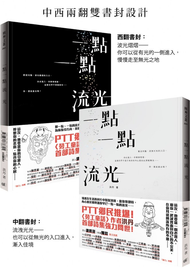 ★中西兩翻雙書封設計,有「波光熠熠」和「流洩光光」兩面設計,你可以從無光的入口進入,漸入佳境;也能從有光的一側進入,慢慢走至無光之地……