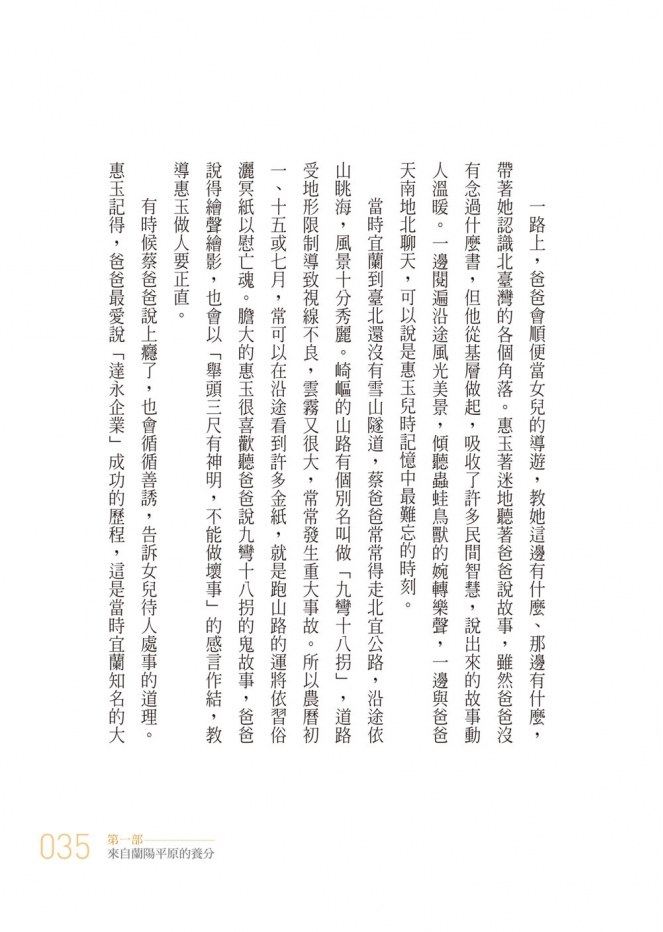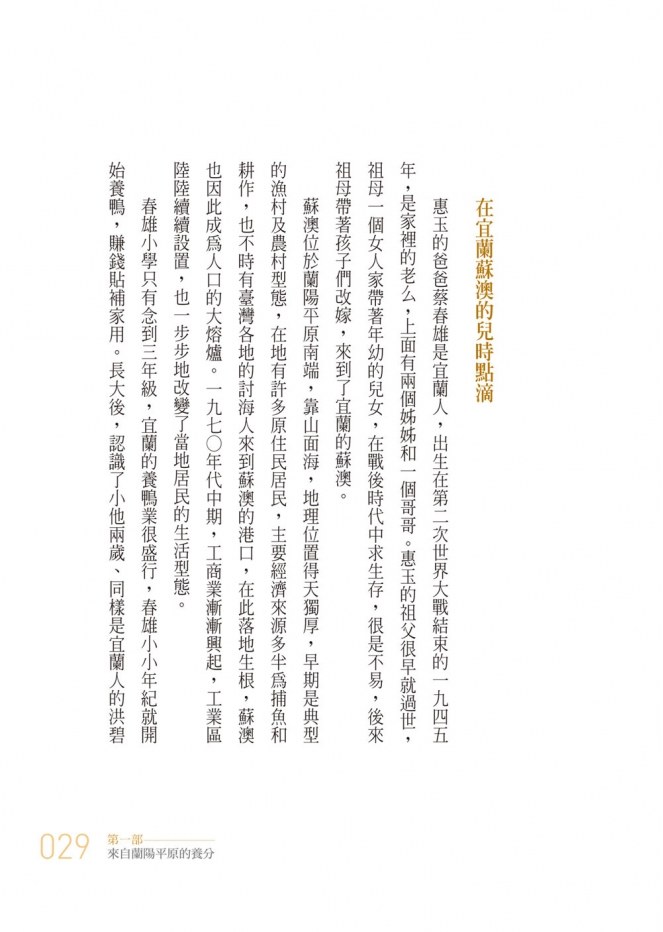 這個宜蘭女兒在生命中的成功絕對不是巧合或運氣,我相信,她樂觀進取、永不放棄的人格養成必定來自她的成長過程。於是,我與惠玉一同尋找她在蘇澳成長的片段,才恍然大悟,這些點點滴滴如何匯集成寬闊的河流,滋潤著她後來走的每一步。因為惠玉,我首度來到了宜蘭,認識她的家鄉。我遇到多位在音樂界和教育界努力付出的人士,與活潑可愛的宜蘭小朋友互動,著迷地聽著許多動人的宜蘭故事。我望著蘭陽平原遠方的地平線,深深感受著這片土地底下湧出的力量,終能理解,宜蘭是如何孕育了惠玉,讓這個東北海岸的女兒在國際上發光發亮。