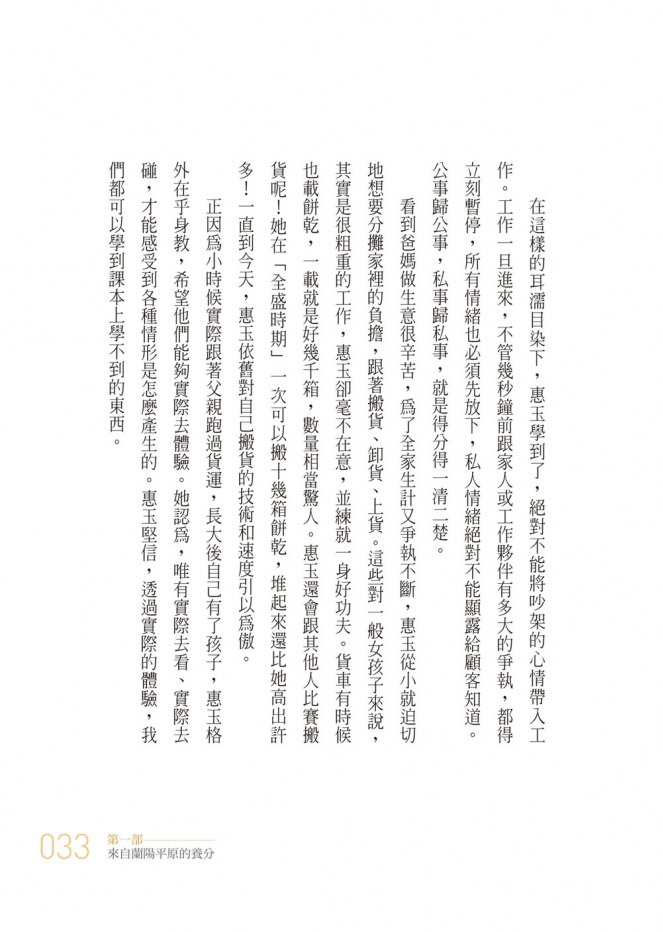 在蘇澳港長大的蔡惠玉,從小跟著爸爸開的貨運卡車東奔西跑。樂觀進取的她,當隨車小妹不但不以為苦,還從中學會了物流、工廠生產、會計、訂合約等超出她年紀的知識與技能,成為日後生涯的備糧。