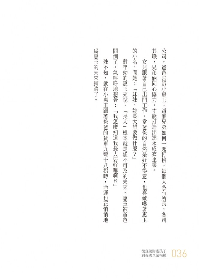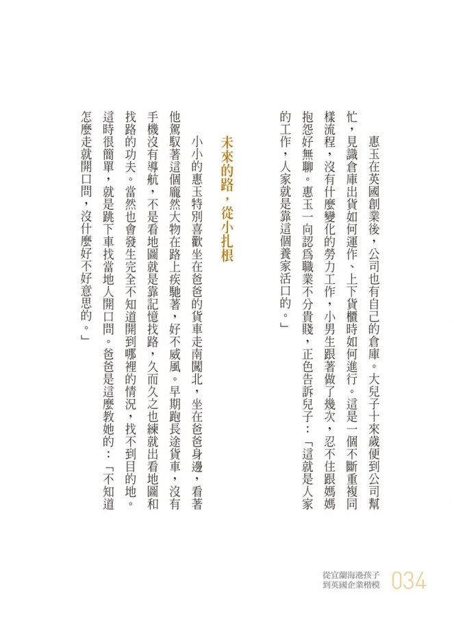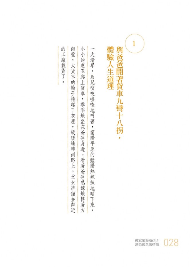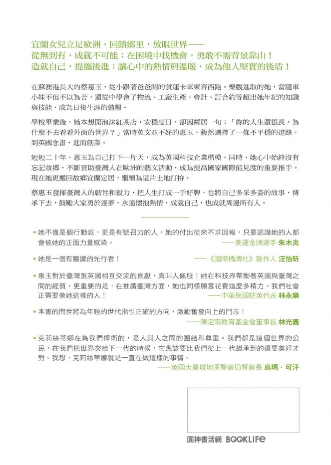 一個來自臺灣宜蘭鄉下小鎮的貨車女孩,如何在二十年的時間內成為一位在英國社會受到尊敬的企業家?為何《國會評鑑》主席埃瑞克.皮克斯爵士(Lord Eric Pickles)主動將她列為英國年度企業楷模?她在教養兩個兒子的時候,如何運用自己的臺英經驗?為什麼在一堆家長想盡辦法把孩子送出國時,她反其道而行,送小兒子回臺讀小學?為什麼她每年都要回家鄉資助母校?為什麼她總是義無反顧地資助文化工作者?