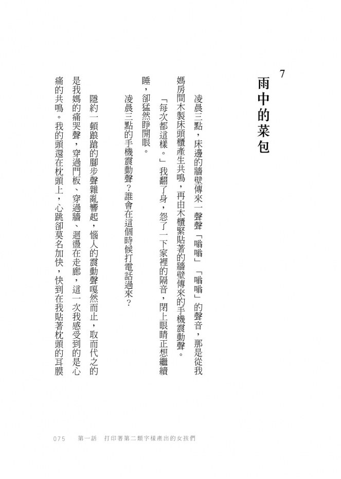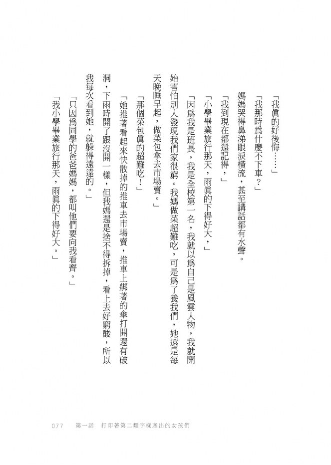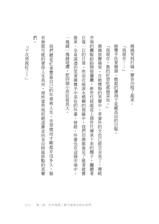 身為女孩,在臺灣,我們幾乎都是這麼長大的。有著類似的故事,也有著同樣的徬徨與無奈。作者在媒體圈工作數年,採訪過無數人,才發現最荒誕離奇的是你我身邊的故事,而那各種無人願意修復的異常,卻是我們日復一日的日常,漸漸習以為常。