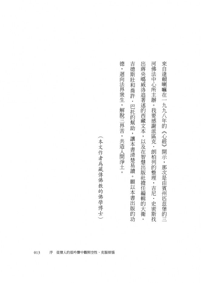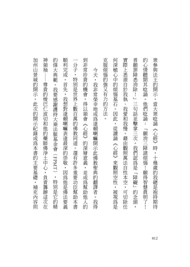 今天,我非常榮幸地成為達賴喇嘛開示此佛教聖典的翻譯者。我得到非常珍貴的機會,得以領會《心經》的深層意義,並成為幫助他人的一分子,特別是世界上數百萬的佛教同道。還有許多重要功臣幫助本書順利完成。首先,我想對達賴喇嘛表達最深的崇敬,因為他是佛法要義的偉大典範。我要感謝護持大乘法脈基金會(FPMT),特別是它的精神領袖—尊貴的梭巴仁波切和他的藥師佛淨土中心,負責籌辦這次在加州山景城的開示。此次的開示紀錄成為本書的主要基礎,補充內容則來自達賴喇嘛在一九九八年的《心經》開示,那次是由賓州匹茲堡的三河佛法中心所主辦。我要感謝派區克‧朗柏列的整理,吉尼‧史密斯找出蔣央噶威洛追著述的西藏文本,以及在智慧出版社擔任編輯的大衛‧吉德斯壯和喬許‧巴托的幫助,讓本書清楚易讀。願以本書出版的功德,迴向法界眾生,解脫三界苦,共造人間淨土。序