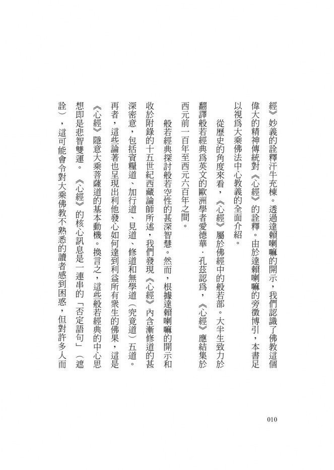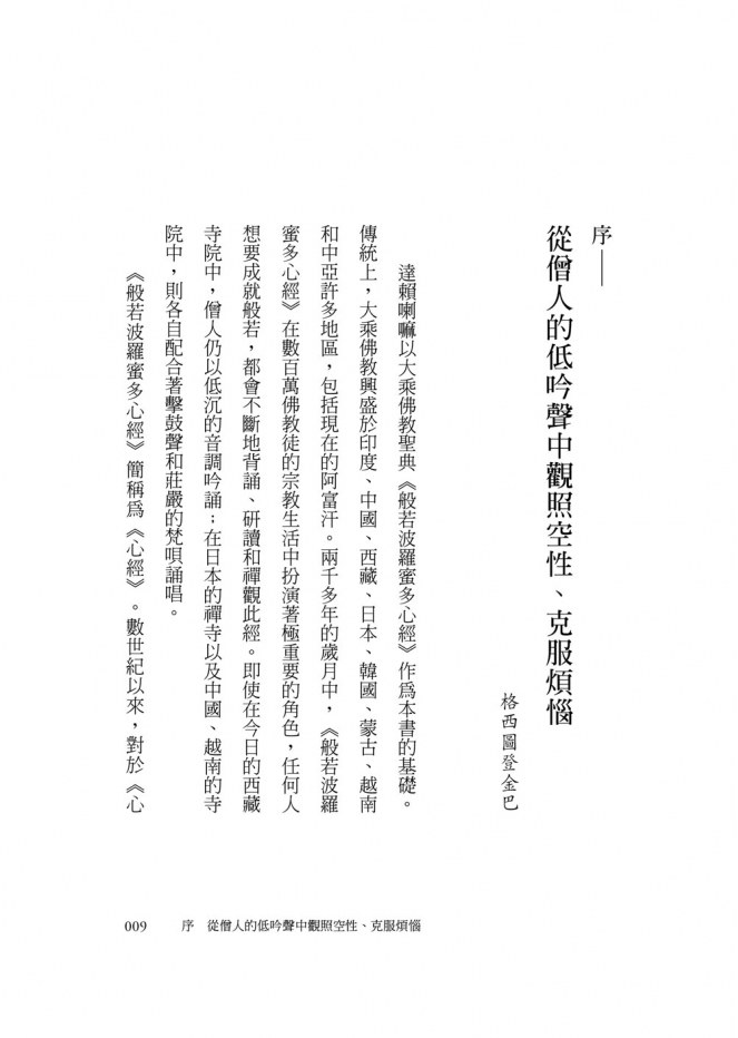 達賴喇嘛以大乘佛教聖典《般若波羅蜜多心經》作為本書的基礎。傳統上,大乘佛教興盛於印度、中國、西藏、日本、韓國、蒙古、越南和中亞許多地區,包括現在的阿富汗。兩千多年的歲月中,《般若波羅蜜多心經》在數百萬佛教徒的宗教生活中扮演著極重要的角色,任何人想要成就般若,都會不斷地背誦、研讀和禪觀此經。即使在今日的西藏寺院中,僧人仍以低沉的音調吟誦;在日本的禪寺以及中國、越南的寺院中,則各自配合著擊鼓聲和莊嚴的梵唄誦唱。《般若波羅蜜多心經》簡稱為《心經》。數世紀以來,對於《心經》妙義的詮釋汗牛充棟。透過達賴喇嘛的開示,我們認識了佛教這個偉大的精神傳統對《心經》的詮釋。由於達賴喇嘛的旁徵博引,本書足以視為大乘佛法中心教義的全面介紹。