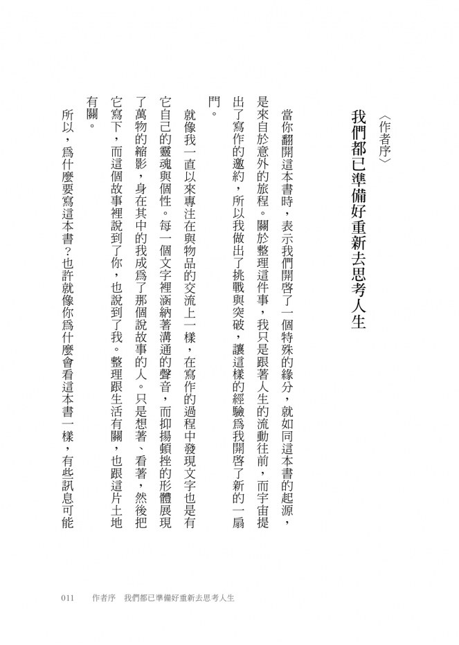 當你翻開這本書時,表示我們開啟了一個特殊的緣分,就如同這本書的起源,是來自於意外的旅程。關於整理這件事,我只是跟著人生的流動往前,而宇宙提出了寫作的邀約,所以我做出了挑戰與突破,讓這樣的經驗為我開啟了新的一扇門。