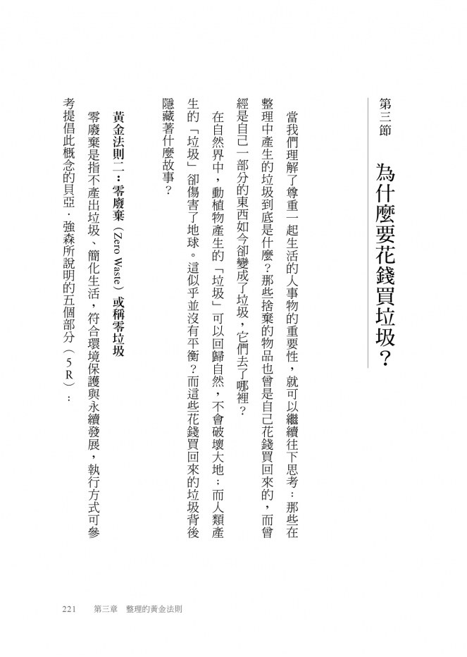 整理不只是方法,也不只是心理層面,更多的是對宇宙萬物的理解、永續共生的思維。作者融合學習經驗及人生概念而發展出的這套「人生整理課」,要教你從「整理」看見自己的思考方式。她要打破收納與整理技巧的迷思,教你從覺察身邊的空間及物品來清理出內心的明淨,教你從編寫「夢想藍圖」開始,檢視每個意識的延伸與影響,逐步建構並看見真實的自己,實現夢想人生。
