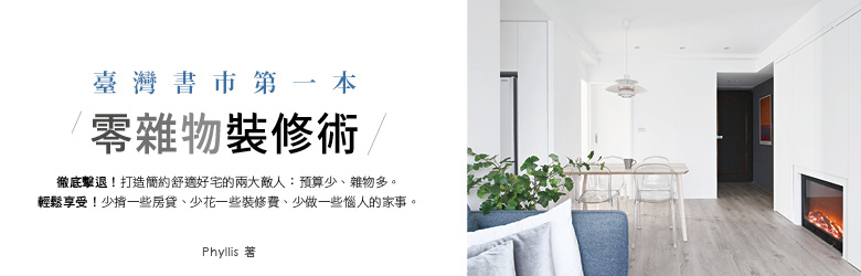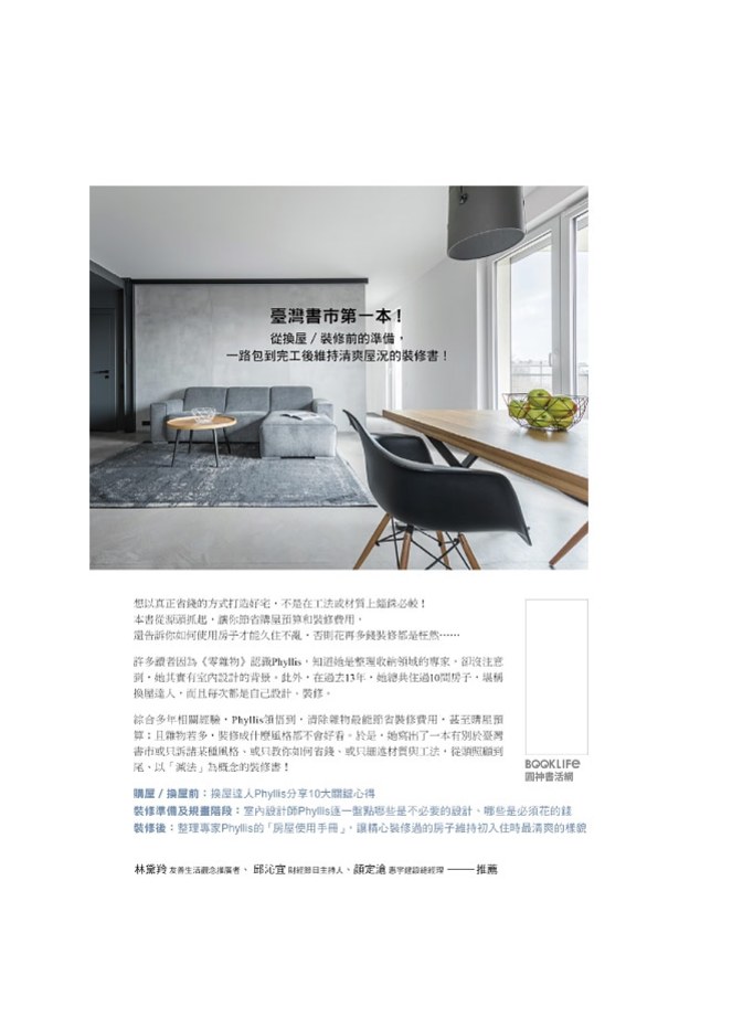 綜合多年相關經驗,Phyllis領悟到,清除雜物最能節省裝修費用,甚至購屋預算;且雜物若多,裝修成什麼風格都不會好看。於是,她寫出了一本有別於臺灣書市或只訴諸某種風格、或只教你如何省錢、或只細述材質與工法,從頭照顧到尾、以「減法」為概念的裝修書!