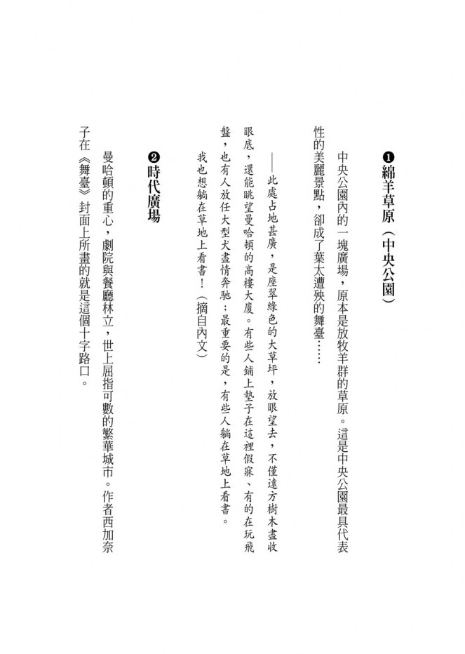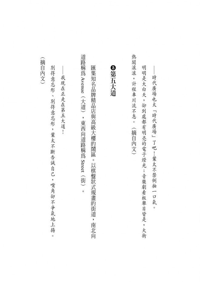 儘管這個心願實在太「紐約」,令葉太不時心虛低嚷,但唯有這個心願,他必須硬著頭皮完成。這是他最愛的作家睽違兩年的新作,看完這一本,還得再等兩年。葉太在飛機上拚命按捺翻閱的衝動,若是偷看了,「在中央公園閱讀這位作家的書」就變得一點意義也沒有。
