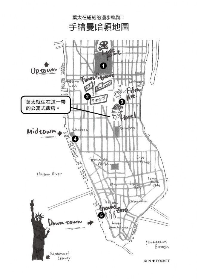葉太沒有將這件事告訴任何人,他發誓要一輩子藏在心裡。他將《地球步方 紐約》背得滾瓜爛熟,然後用父親的錢展開此生首度的個人旅行。