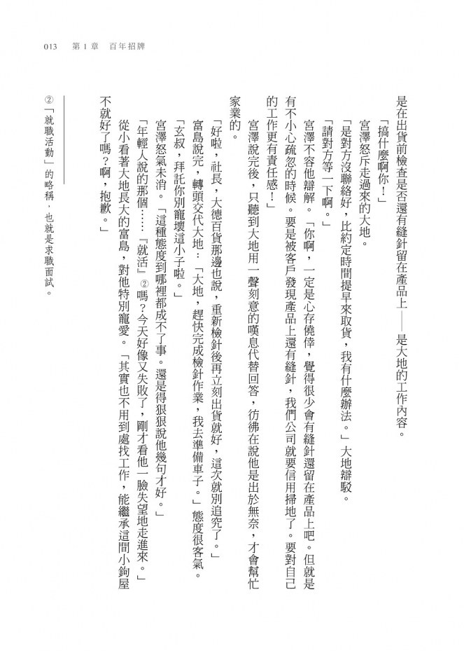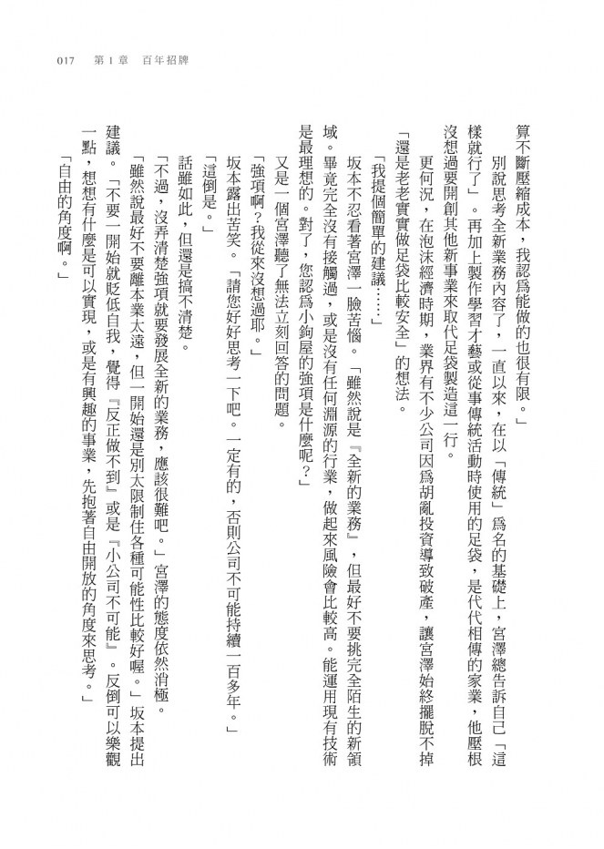 坂本不忍看著宮澤一臉苦惱。「雖然說是『全新的業務』,但最好不要挑完全陌生的新領域。畢竟完全沒有接觸過,或是沒有任何淵源的行業,做起來風險會比較高。能運用現有技術是最理想的。對了,您認為小鉤屋的強項是什麼呢?」