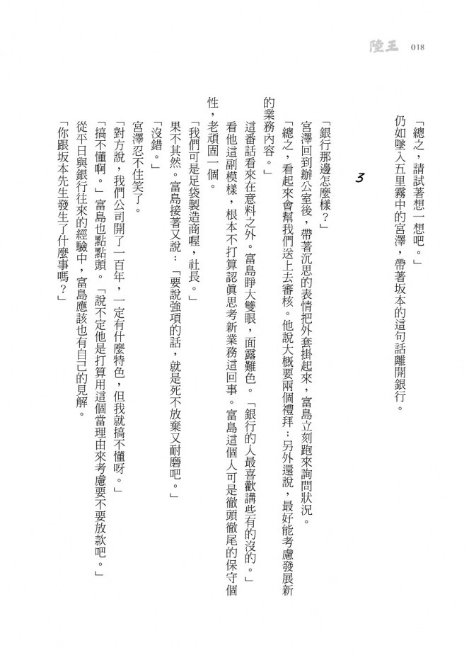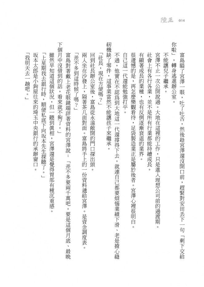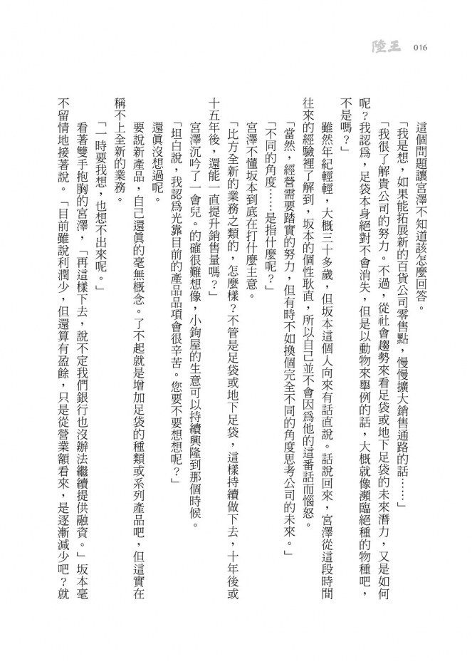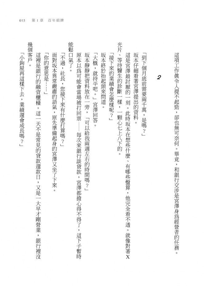 看著雙手抱胸的宮澤,「再這樣下去,說不定我們銀行也沒辦法繼續提供融資。」坂本毫不留情地接著說。「目前雖說利潤少,但還算有盈餘,只是從營業額看來,是逐漸減少吧?就算不斷壓縮成本,我認為能做的也很有限。」