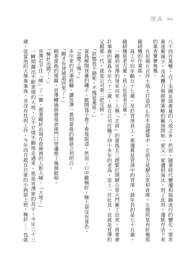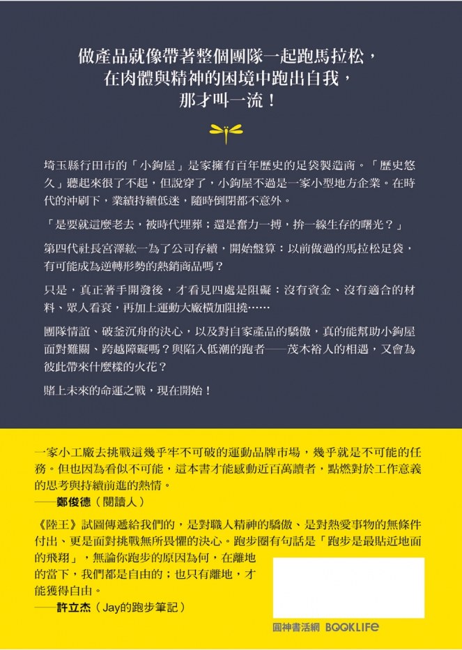 接下來與你介紹的這本書《陸王》就是面對這樣的光景,書中主角宮澤紘一繼承了一家製作足袋的百年老店「小鉤屋」,他的首要任務就是要克服時代潮流的衝擊,在幾乎沒落的夕陽產業中,轉型為運動鞋製造商的故事。