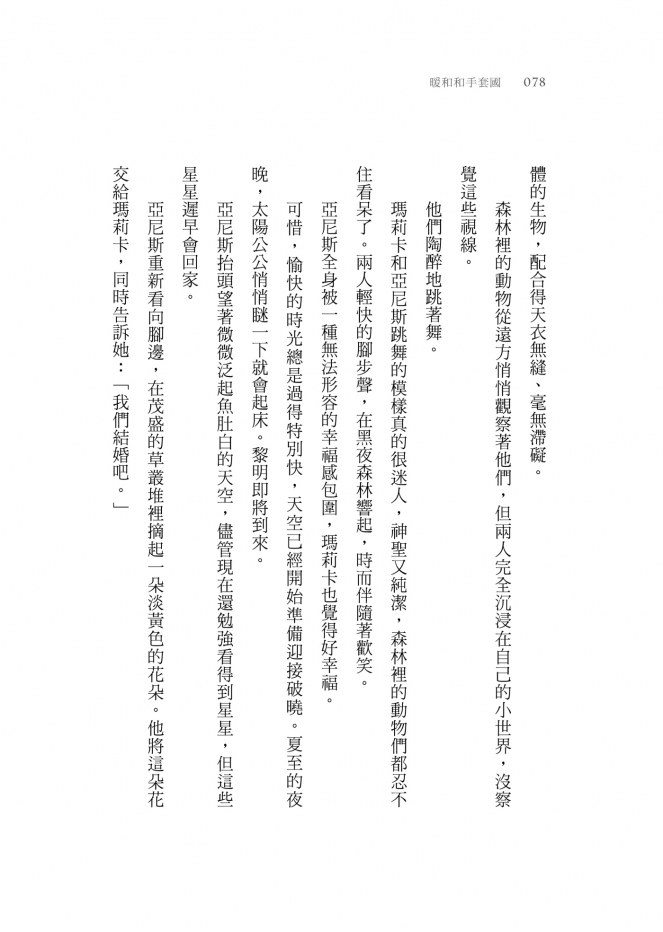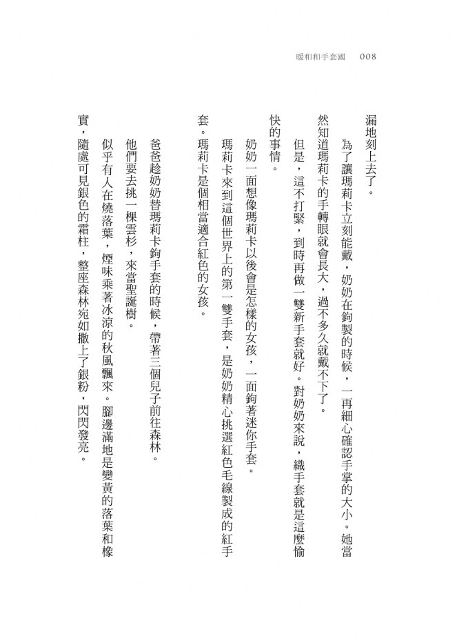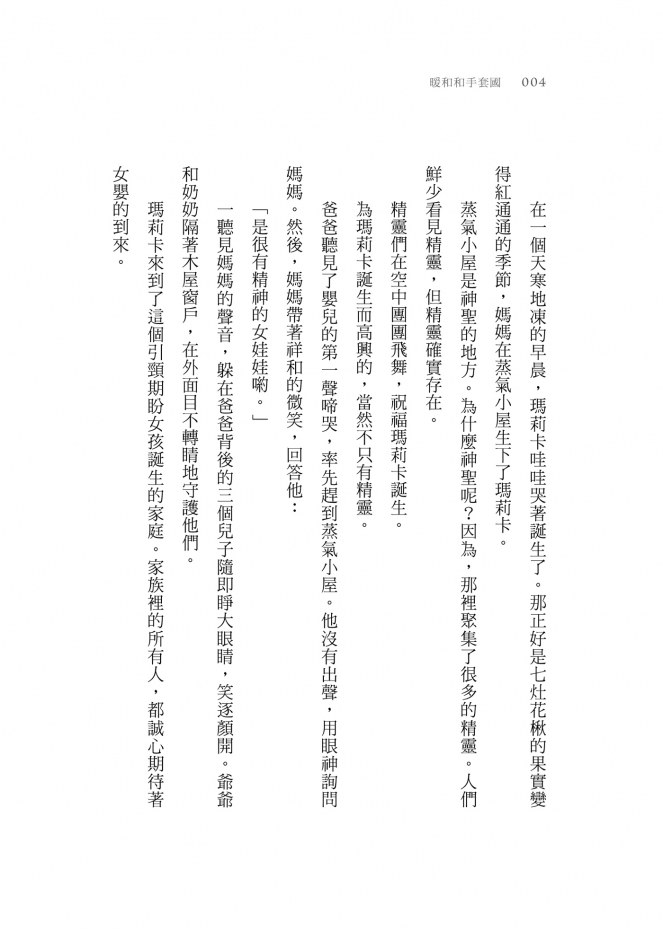 她生命中的重要時刻,都有手套相伴,出生時、戀愛時、結婚時,甚至在冰之帝國入侵,導致她不得不與心愛的丈夫分離的那一刻。每一回收到或是遞出手套,瑪莉卡都更明白一點、更體悟一分,原來把情意與溫暖編入手套,跟著神的祝福一起送給所愛之人,竟能帶給自己這麼大的安慰。