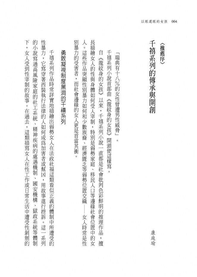 自《龍紋身的女孩》以來,千禧系列小說一直是社會批判色彩鮮明的推理作品。作者擅長描繪女性和孩童的人生如何受人宰制──特別是他們在法政社福這類看似正義的體制中所受的宰制。