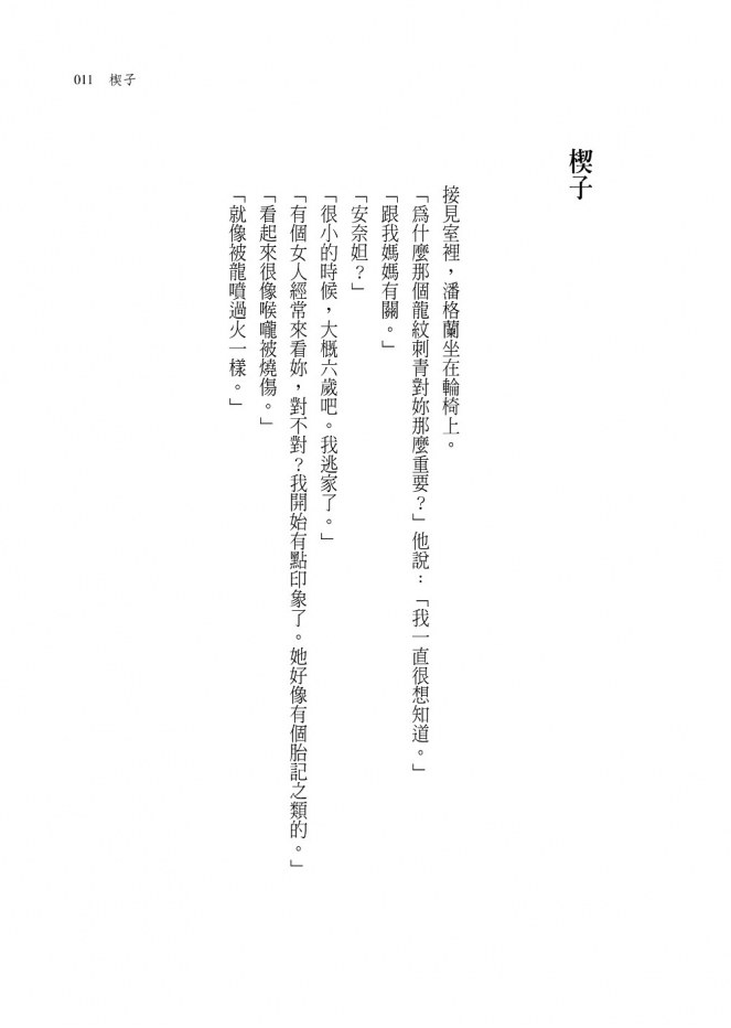 她聆聽著走廊上的聲響。可以聽到低聲的咒罵,還可以聽到一道道門砰然關閉、鑰匙喀喇喀喇作響,以及漸行漸遠的清脆腳步聲。接著寂靜降臨,唯一只剩空調設備還發出聲音。空調壞了,空氣悶得讓人難受,機器卻依然轟隆隆響個不停。莎蘭德望向地上的紙張,心裡想著貝尼托、法黎雅和歐森──還有那個咽喉處有火吻胎記的女人。