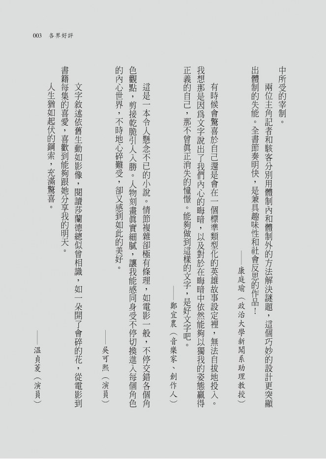 兩位主角記者和駭客分別用體制內和體制外的方法解決謎題,這個巧妙的設計更突顯出體制的失能。全書節奏明快,是兼具趣味性和社會反思的作品!──康庭瑜(政治大學新聞系助理教授)