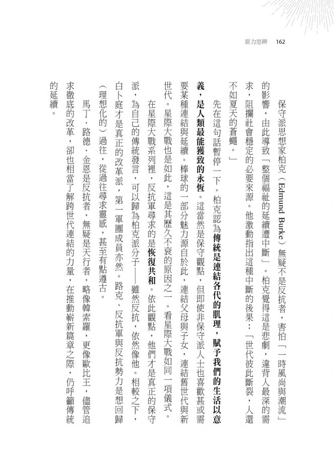 先在這句話暫停一下。柏克認為傳統是連結各代的肌理,賦予我們的生活以意義,是人類最能獲致的永恆。這當然是保守觀點,但即使非傳統分子也喜歡甚或需要某種連結與延續。棒球的一部分魅力源自於此,連結父母與子女,連結舊世代與新世代。星戰也是如此,這是其歷久不衰的原因之一。看星戰如同一項儀式。