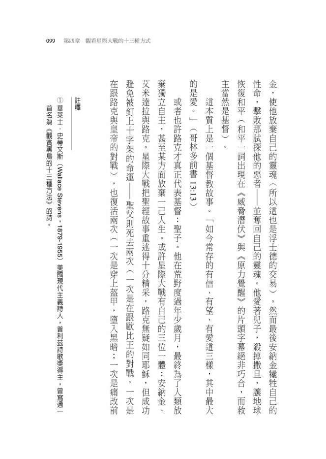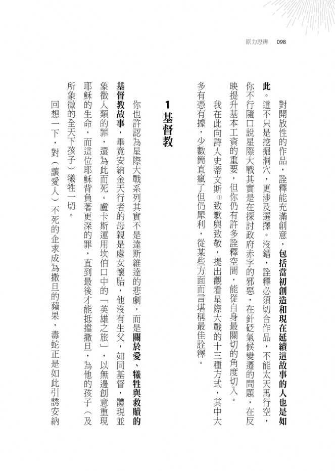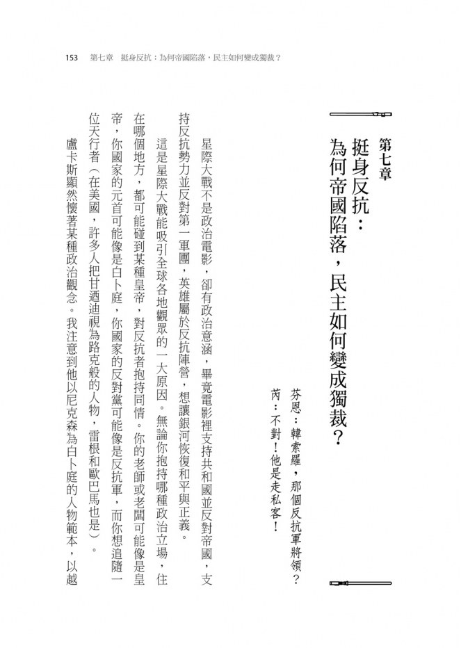 本書會試著回答所有這些問題。幸好星際大戰如同詩作或小說,有各式詮釋空間。星際大戰是大力抨擊帝國並擁護民主,還是恰好相反?星際大戰真的偏好光明勢力,還是暗自迷戀黑暗勢力?原力是上帝,還是我們每個人都有的某個東西?星際大戰如何看待基督信仰?如何看待性別與種族?如何看待資本主義?如何看待忠誠的意義?如何看待當前歷史的發展?