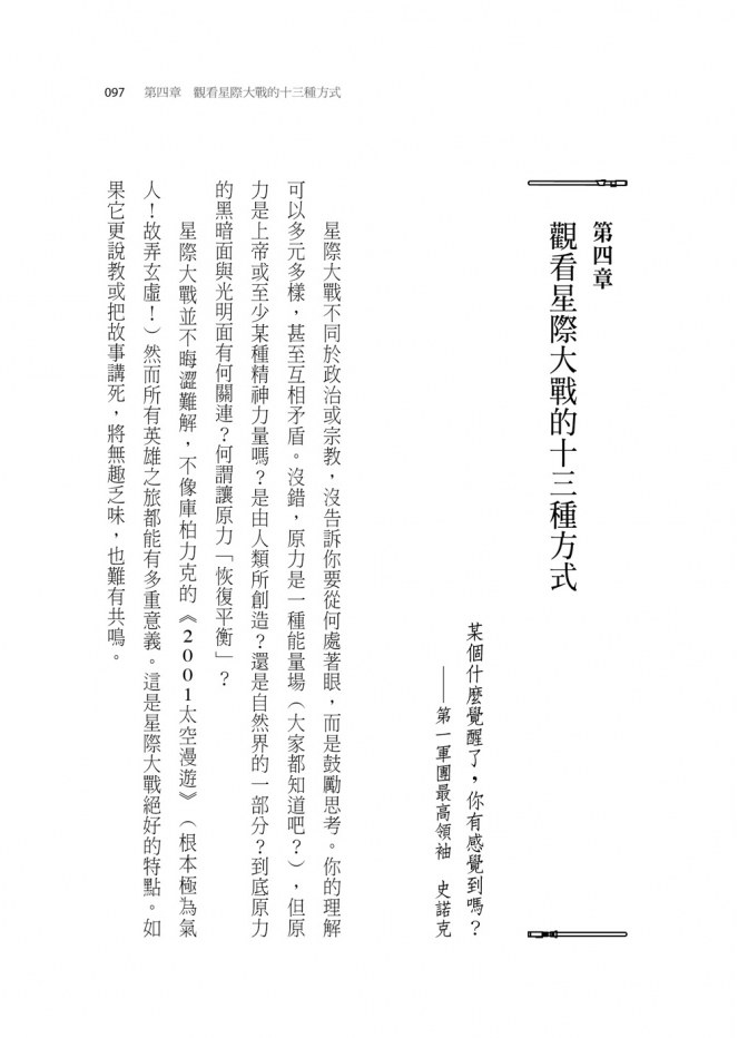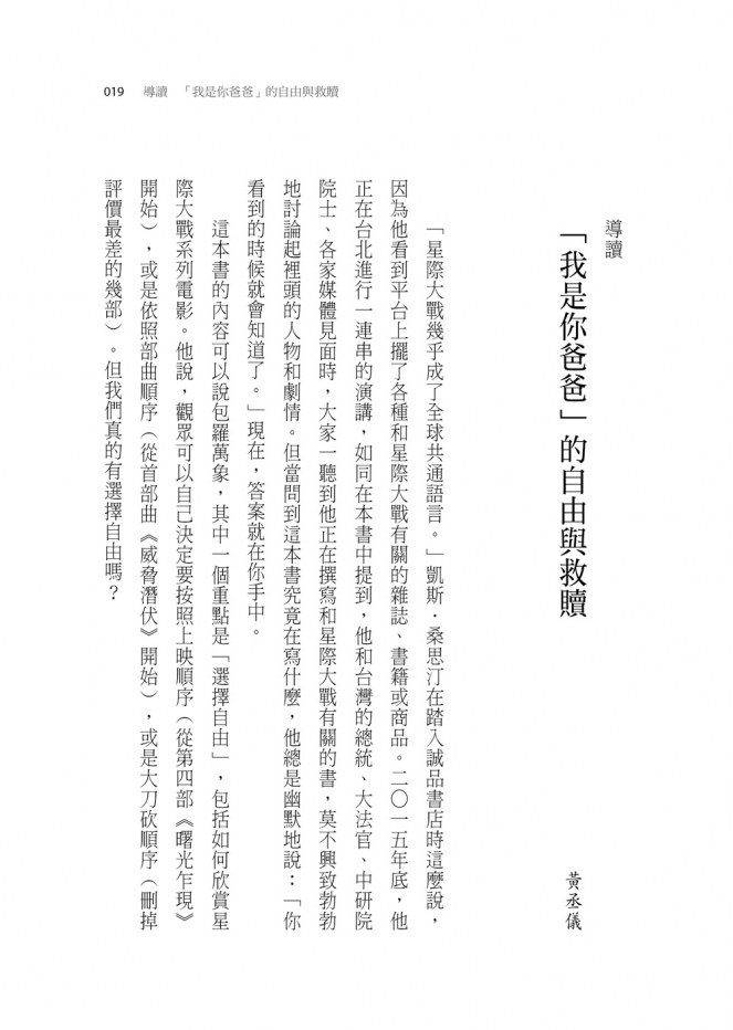 如果不按照上映順序來看,星戰系列似乎就會分崩離析,失去魅力。如果按照上映順序來看,我們不也是在創作者寫好的劇情當中,走一遍路克的銀河歷險記(和「自我發現之旅」)?一切都是創作者的設定。當然,我們也可以選擇完全不看星際大戰,也不看這本書。如同桑思汀所說,這個世界上大致上有三類人:喜歡星際大戰、不喜歡星際大戰、不喜歡也不討厭星際大戰。(其實,所有的事情都可以這樣分類吧?喜歡香菜、不喜歡香菜,不喜歡也不討厭香菜。)如果你不喜歡星際大戰,可能在第一章就會卡住。但是,這時候不要忘了,你有選擇自由,你可以從任何一章開始,組織你自己的《原力思辨》。