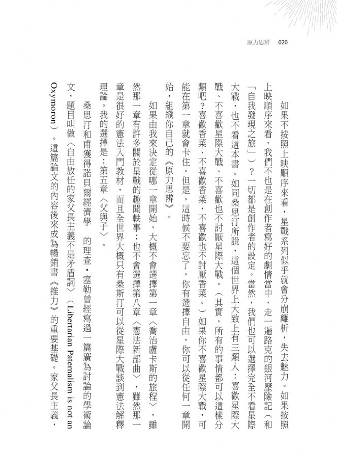 如果由我來決定從哪一章開始,大概不會選擇第一章〈喬治盧卡斯的旅程〉,雖然那一章有許多關於星戰的趣聞軼事;也不會選擇第八章〈憲法新部曲〉,雖然那一章是很好的憲法入門教材,而且全世界大概只有桑斯汀可以從星際大戰談到憲法解釋理論。我的選擇是:第五章〈父與子〉。